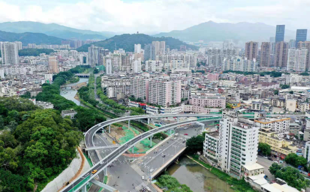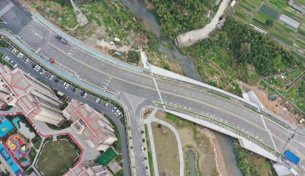 羅橋節點改造提升工程2019年11月開工建設,2021年8月建成通車。該項目沿北環西路、龍興路設置南北分離式雙向四車道高架,南側接龍興路,北側接現狀北環西路,高架靠東側布置(緊貼烈士陵園),橋梁總長約1140米,凈寬約7.7米;在雙洋路、龍川北路、北環西路設置人行天橋,與山體步道銜接,以完善慢行系統;在烈士陵園山體下采用明挖回填方式設置框涵,長度約225米,凈寬10.75米。工程投資1.4億元。